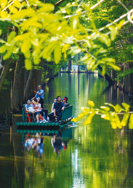 8月30日,游人在江苏省淮安市金湖县水上森林景区乘坐竹筏游览美景(无人机照片)。