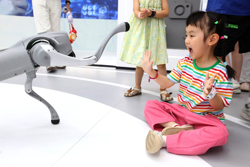 近日,在位于江苏省徐州市云龙区的一家科学探索馆,小朋友与机器狗互动。新华社发