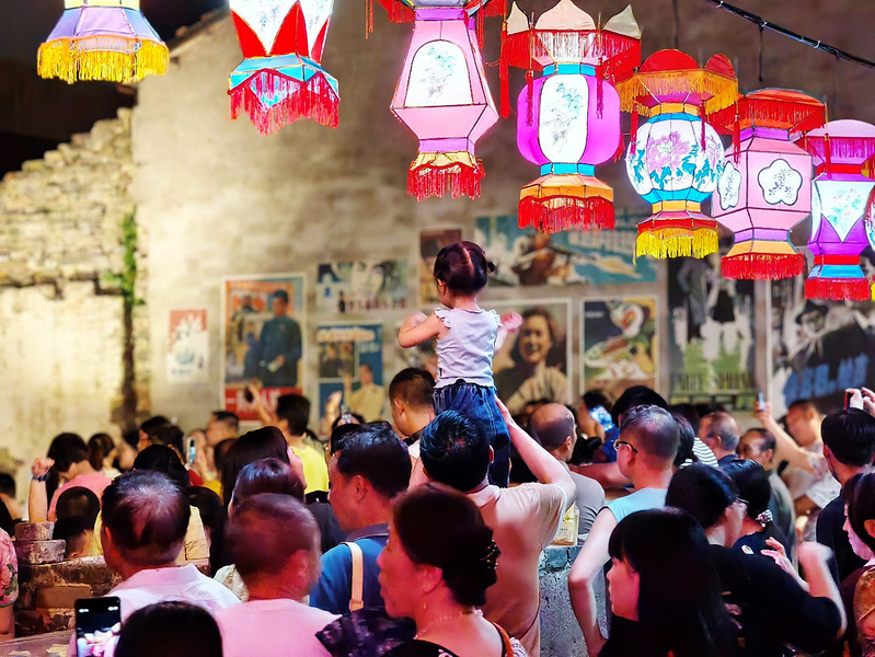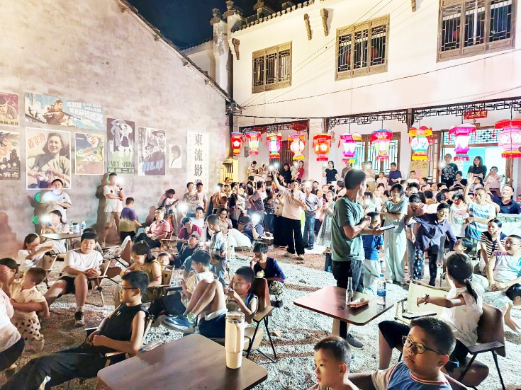 国庆假期,持续上演的“迎曦”双节文艺季中,多项活动迎来关键节点。在“璀璨非遗・潮韵东流”活动中,六兽灯、旱船灯沿老街巡游,非遗风采引得众人驻足喝彩;“东流电影季”十分火爆,老街露天电影院座无虚席,老式电影胶片机点亮光影,唤醒几代人共同的观影记忆。“曲岸持觞音乐季”每晚准时在曲岸LiveHouse开启,驻唱歌手携琴登台,让游客在音乐声中“打捞千年月光”,重拾东流古镇诗意。