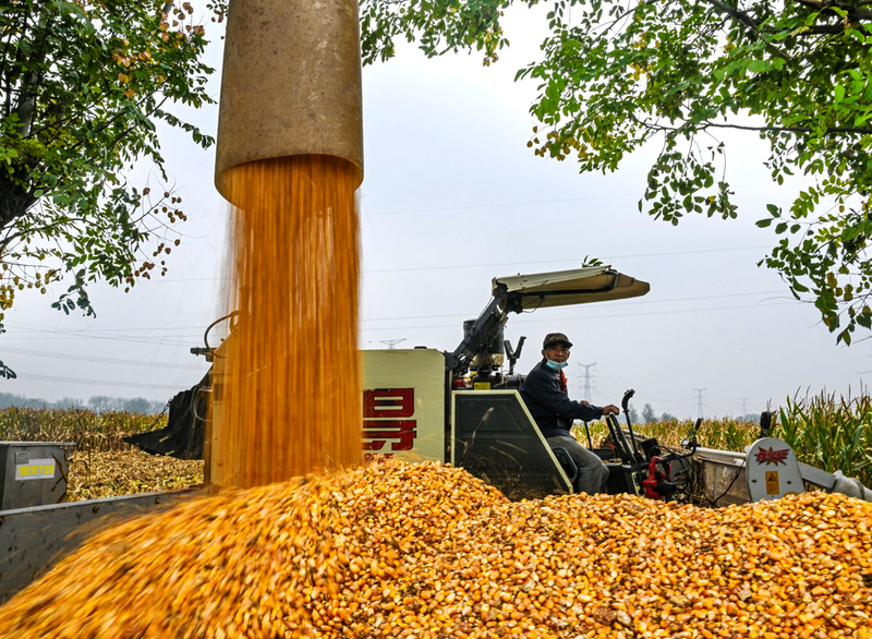 2025年10月8日,河南省商丘市夏邑县会亭镇郭楼村农民驾驶收割机收获玉米。