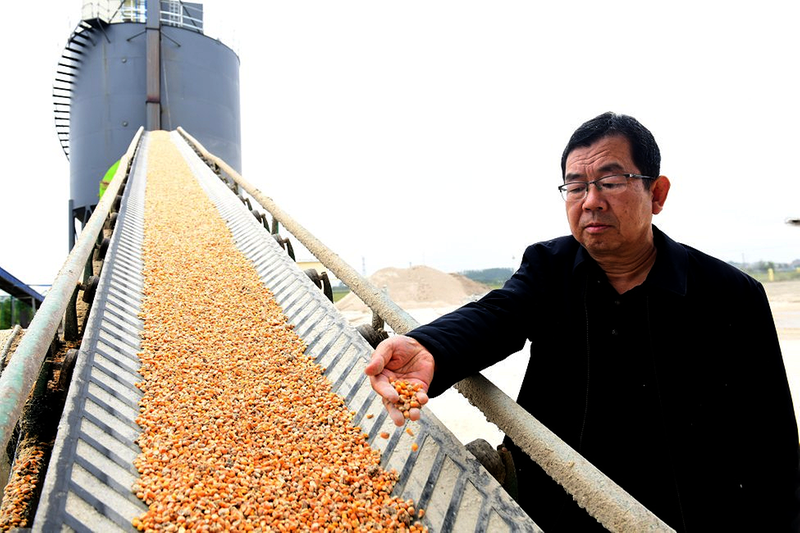 2025年10月11日,在山东省郓城县丁里长街道一处粮食烘干点,县农业农村局的工作人员查看玉米烘干情况。