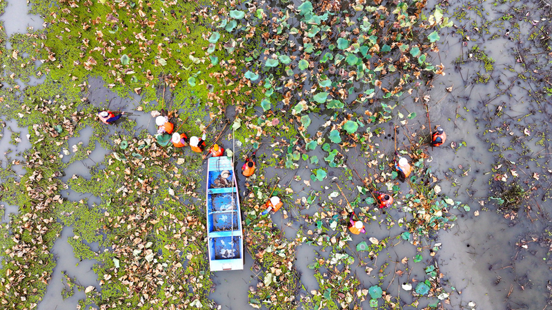 图为10月14日,工作人员正在月亮湖水域清理水草。 记者 张延鹤 摄