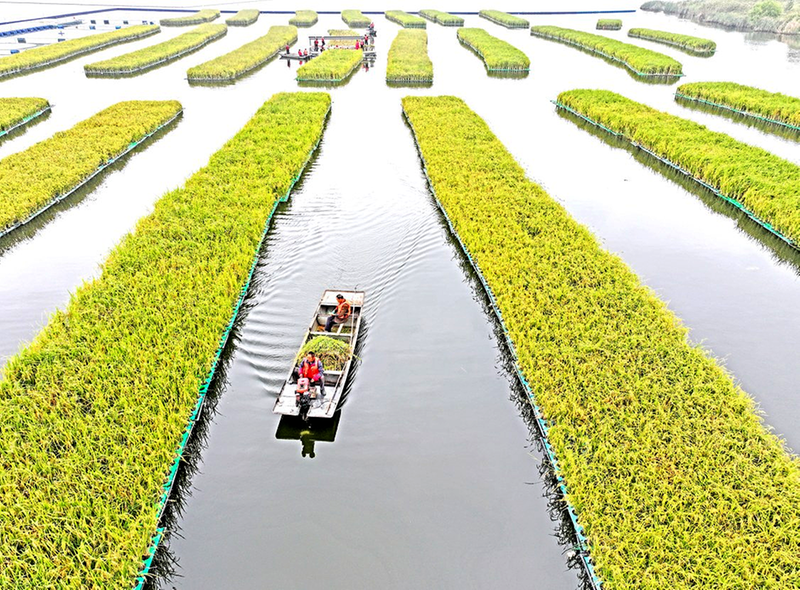 近日,安徽省淮南市凤台县顾桥镇采煤沉陷区50亩漂浮式水稻迎来丰收。当地积极探索采煤沉陷区综合治理开发利用,在采煤沉陷区推行水面漂浮水稻种植、水下网箱养鱼、水上光伏电站等多种发展模式,科学利用好采煤沉陷区。 新华社发(陈彬 摄)