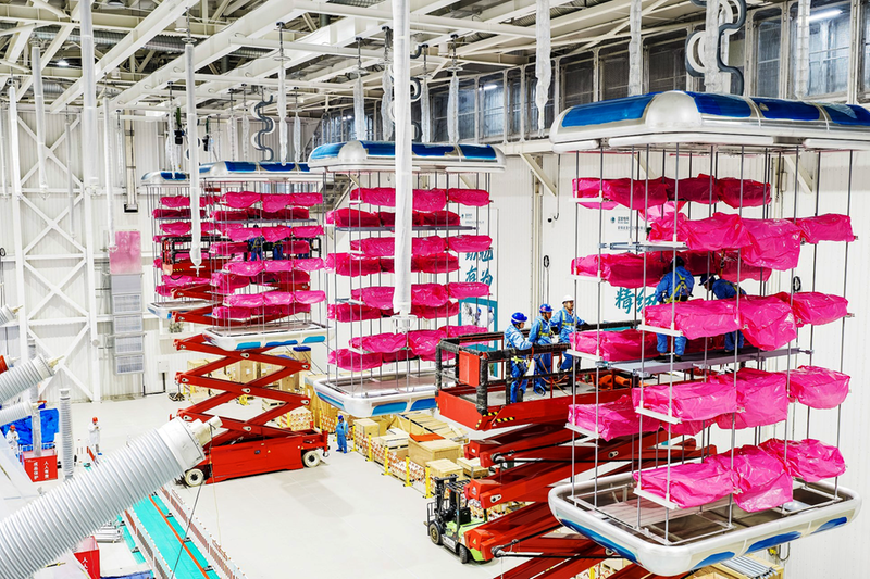 10月16日,在位于合肥市庐江县的合州换流站施工现场,安徽送变电工程有限公司的技术人员在进行国产换流阀的安装作业(无人机照片)。