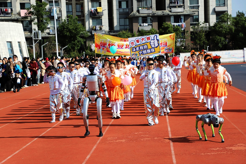 10月22日,贵池区人民路小学秋季田径运动会开幕式上,由学生与人型机器人、机器狗组成的“未来先锋”方阵惊艳亮相。 记者 丁瑶 摄