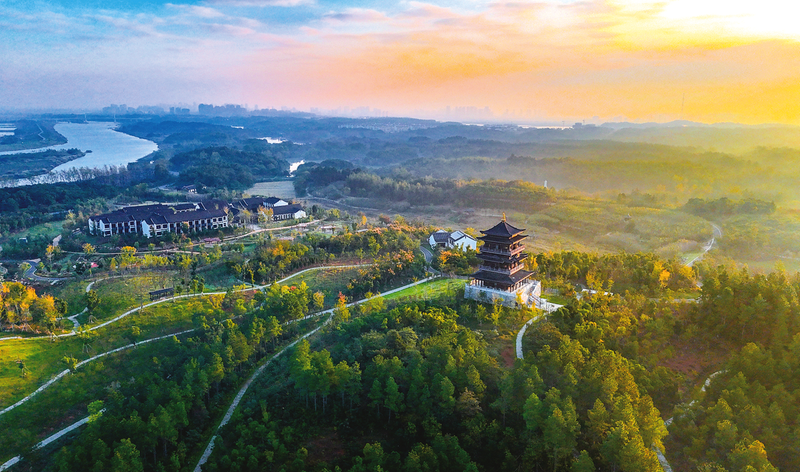 秋日朝阳下,杏花村文化旅游区层林尽染、色彩斑斓。古朴的塔楼矗立在林海间,蜿蜒步道镶嵌于斑斓草木边缘,远处波光粼粼的河湖与错落有致的城市天际线交相辉映,绘就出一幅诗意文旅画卷。