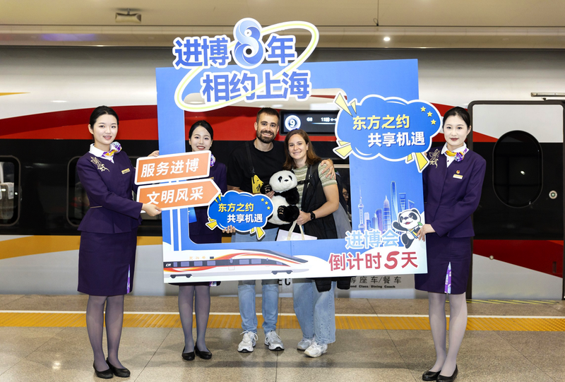 第八届中国国际进口博览会开幕在即,中国铁路上海局集团有限公司上海客运段在上海虹桥站开展“进博8年 相约上海”主题活动,在G8次列车上向旅客介绍进博会亮点。