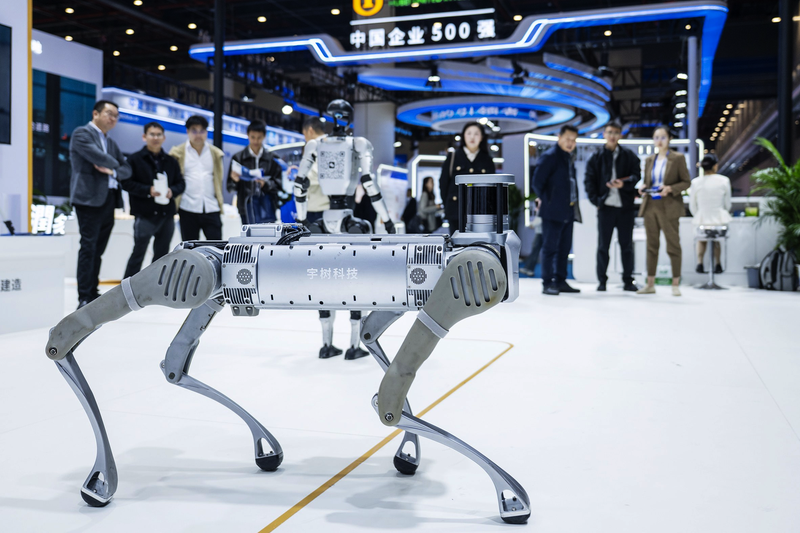 10月31日,观众在博览会现场参观宇树科技的智能机器狗。