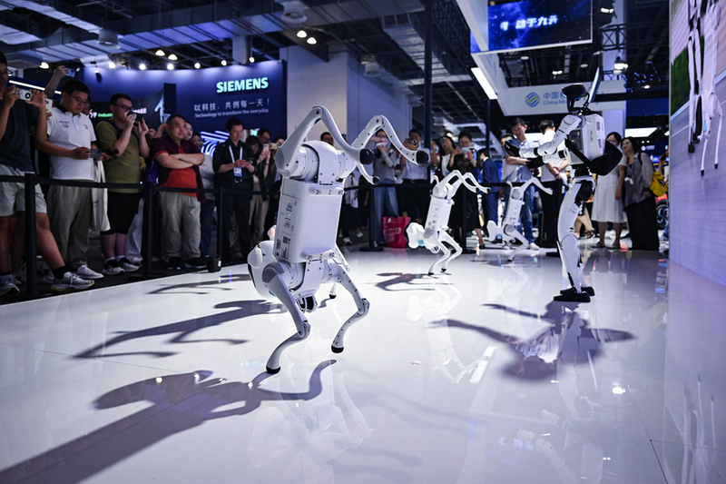 中国移动自研机器狗及机器人在进行舞蹈表演,吸引参观者驻足。 新华社记者 陈浩明 摄