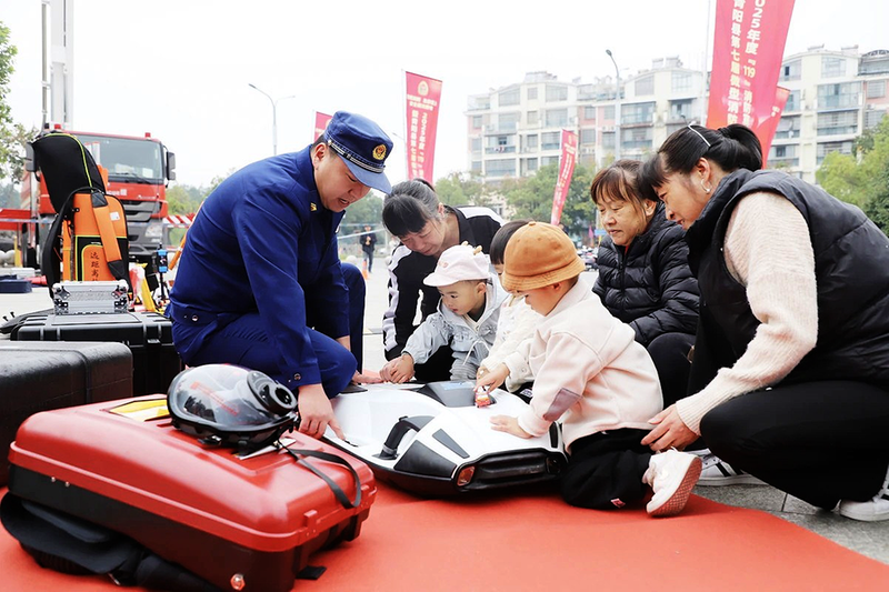 近日,青阳县2025年度“119”消防宣传月活动启动仪式举行,现场划分消防知识问答区、车辆器材装备展示区、消防宣传互动区、消防趣味体验区等,群众通过“零距离”观摩学习、“体验式”沉浸感受、“ 互动式”知识问答,体验了一场精彩纷呈的消防宣传活动。图为活动现场。