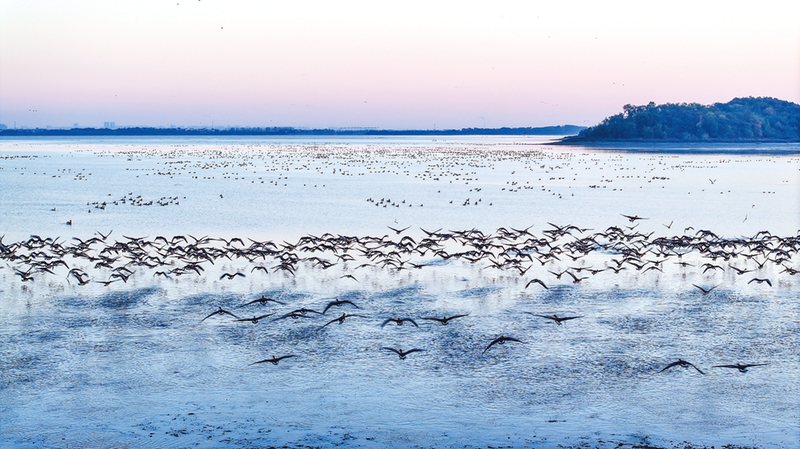 11月19日清晨,4万余只白头鹤、东方白鹤、小天鹅和豆雁等候鸟齐聚升金湖国家级自然保护区,呈现一幅水清岸绿、飞鸟翔集的生态画卷。随着气温逐渐降低,升金湖迎来候鸟迁徙高峰,预计今冬来升金湖越冬的候鸟总数将达10万只。
