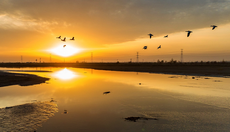 2025年11月11日,候鸟在宁夏平罗天河湾国家湿地公园上空飞翔(无人机照片)。宁夏平罗天河湾国家湿地公园位于宁夏石嘴山市平罗县境内,紧邻黄河,是黄河流域重要的生态屏障。新华社记者 杨植森 摄