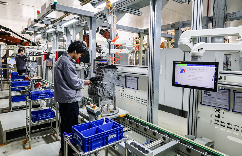 11月27日,在位于金华市金东区的浙江骊勒新能源有限公司的生产车间内,流水线上正在加工新能源汽车的智能增程器。新华社记者 徐昱 摄