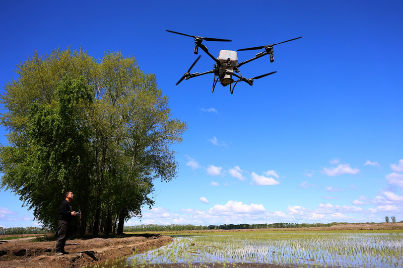 2025年5月21日,在北大荒集团黑龙江绥滨农场有限公司东井管理区,操作员操控搭载北斗导航系统的植保无人机,对即将施返青肥的地块进行打点。