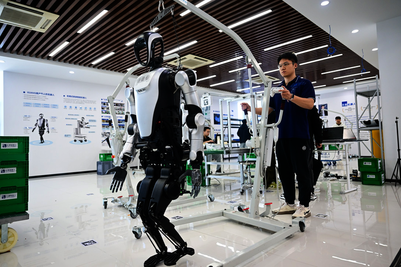 2025年10月24日,在合肥乐聚机器人技术有限公司,机器人应用开发工程师张鸿伟在实验室内调试机器人。