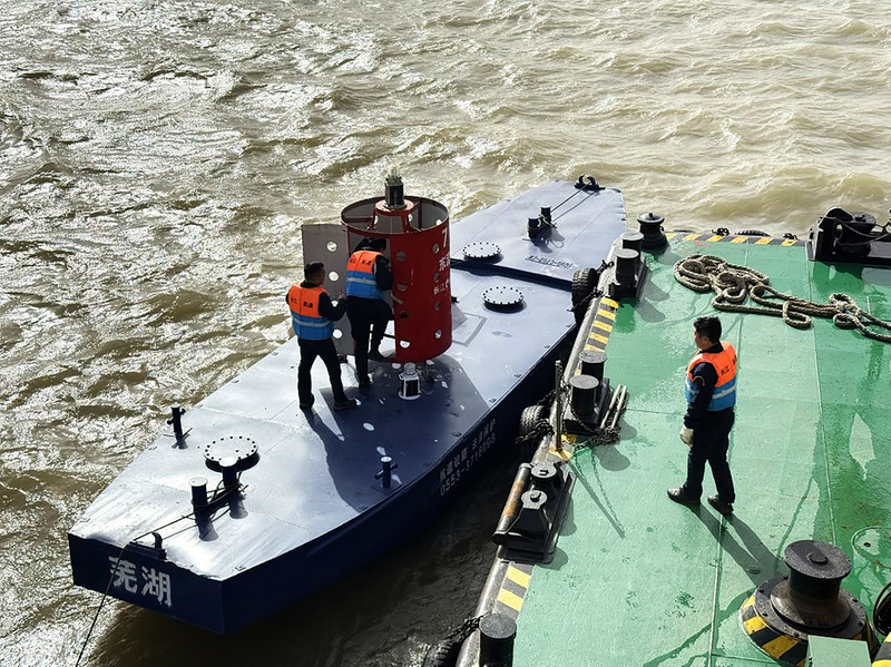 为保障枯水期航道安全,连日来,长江华阳航道处组织工作人员根据长江(池州段)水情动态,调整优化航标布局,确保船舶航行导向清晰。图为工作人员在检查航标技术状况。