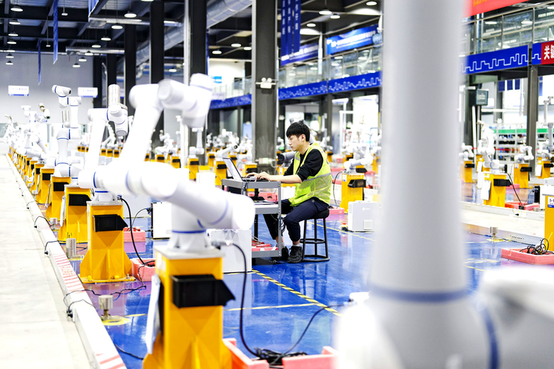 工作人员在山东省日照市经济技术开发区越疆机器人日照生产基地对机械臂产品进行测试(2025年5月24日摄)。 新华社记者 张笑宇 摄
