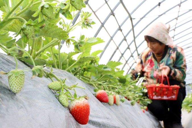 12月16日,农民在山东省滨州市博兴县湖滨镇柳童村大棚里采摘草莓。