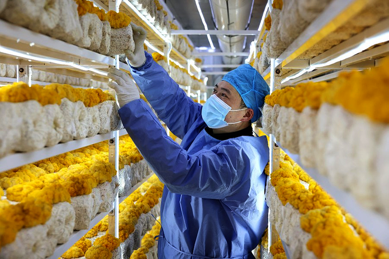 12月16日,山东省枣庄市市中区农民在“智慧菇房”管护食用菌菇。