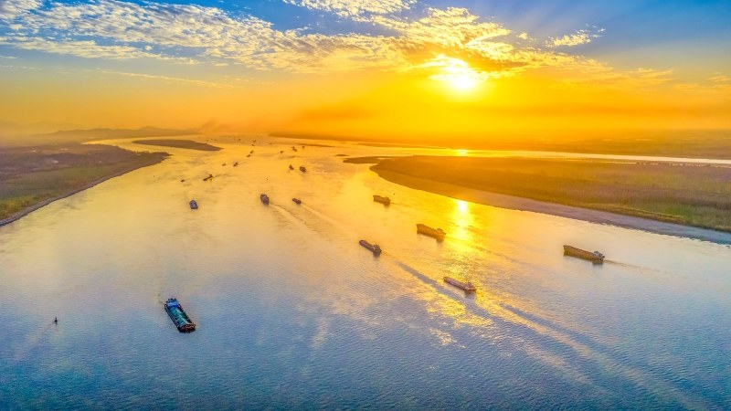长江东至县东流段,晚霞如锦缎铺展天际,将江面染成温暖的橘红。川流不息的船只在波光里缓缓穿行,与岸边摇曳的芦苇、疏朗的树木相映成趣,勾勒出一幅冬日长江航运的醉美画卷。