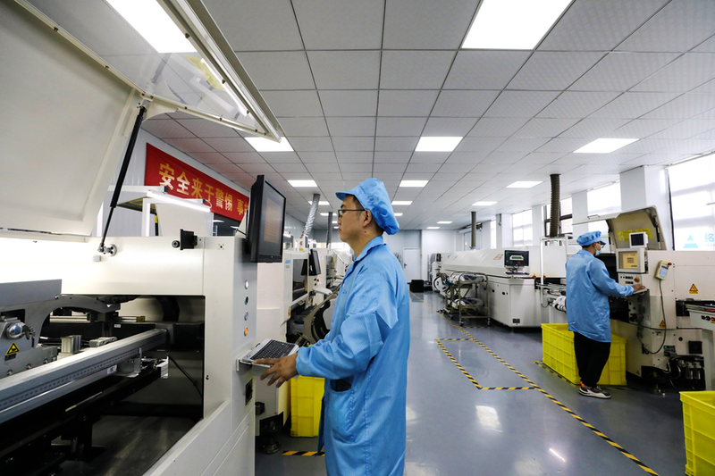 公司自2024年3月投产运营以来,不断加大研发力度,提升服务质量,先后被认定为池州市企业研发中心、安徽省创新型中小企业、国家级科技型中小企业和国家级高新技术企业,拥有各类知识产权27项。今年以来,公司保持良好发展态势,实现营业收入4000余万元。图为SMT贴片车间生产场景。