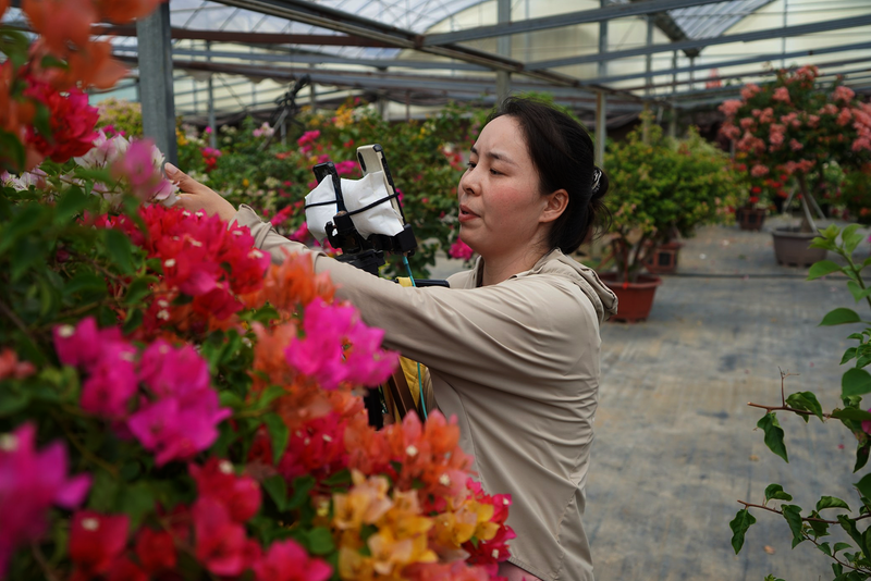 沭阳县新河镇新槐社区居民陈浩在网络直播中推介三角梅(7月23日摄)。 新华社发(刘臻睿 摄)