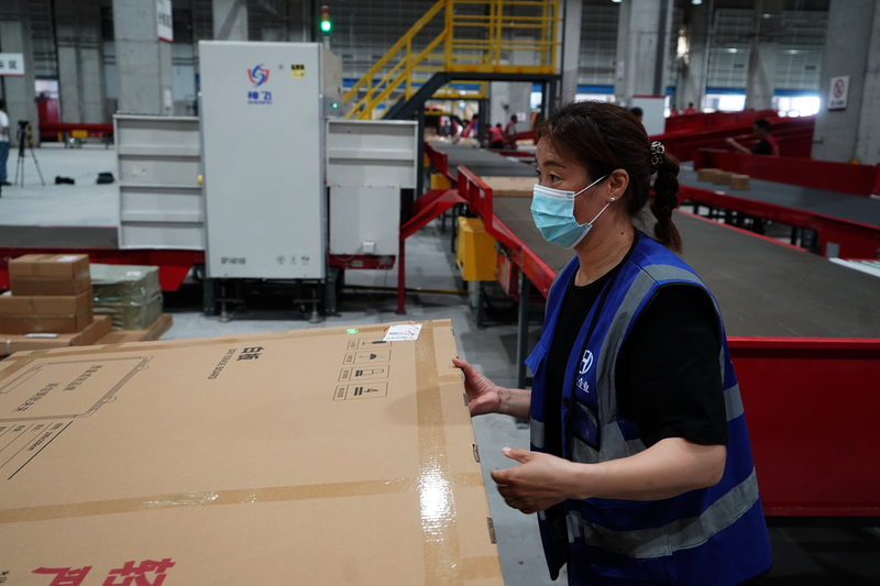 沭阳县华东智慧物流园卸车区的工人在搬运货物(7月23日摄)。新华社发(刘臻睿 摄)