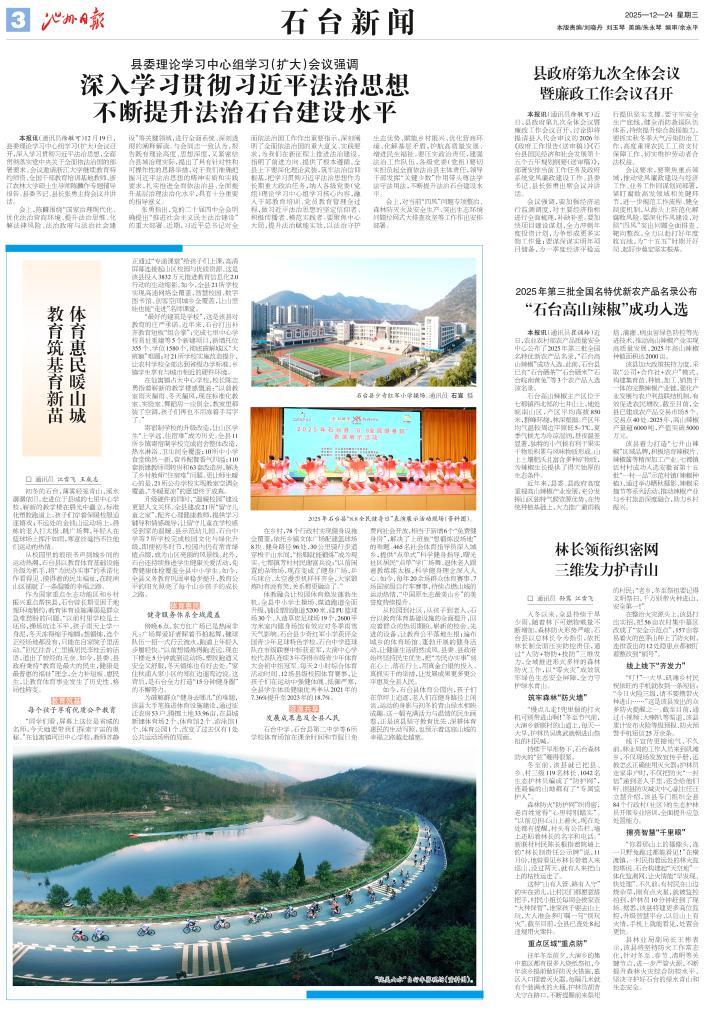 张勇指出,党的二十届四中全会明确提出“推进社会主义民主法治建设”的重大部署。近期,习近平总书记对全面依法治国工作作出重要指示,深刻阐明了全面依法治国的重大意义、实践要求,为我们在新征程上推进法治建设,指明了前进方向、提供了根本遵循。全县上下要深化理论武装,筑牢法治信仰根基,把学习贯彻习近平法治思想作为长期重大政治任务,纳入各级党委(党组)理论学习中心组学习核心内容,融入干部教育培训、党员教育管理全过程,做习近平法治思想的坚定信仰者、积极传播者、模范实践者。要聚焦中心大局,提升法治赋能实效,以法治守护生态优势、赋能乡村振兴、优化营商环境、化解基层矛盾,护航高质量发展、增进民生福祉。要压实政治责任,建强法治工作队伍,各级党委(党组)要切实担负起全面依法治县主体责任,领导干部发挥“关键少数”作用带头尊法学法守法用法,不断提升法治石台建设水平。