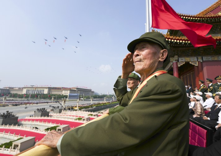 2025年9月3日,纪念中国人民抗日战争暨世界反法西斯战争胜利80周年大会在北京隆重举行。这是抗战老战士在天安门城楼上敬礼。 新华社记者 才扬 摄