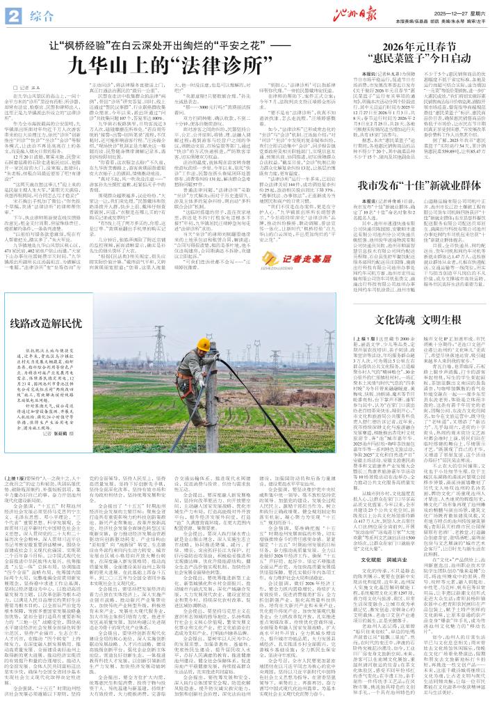 城市文化空间提质升级,乡村文化生活同样多姿多彩。石台县硒阅·东庄乡村公共文化空间里,村民汪昌华正捧着一本书认真研读。“不忙的时候带孩子来这里看看书,既能拓宽自己的知识面,也能当个表率,帮助孩子养成阅读习惯。”小河镇东庄村村委会文书、农家书屋管理员陈梦告诉记者,这里藏书2000余册,涵盖文学、少儿等品类,定期开展农技培训、亲子阅读、政策宣讲等活动,年均服务群众超3万人次,可为周边5公里左右群众提供公共文化服务,已是凝聚乡村人气的“精神粮仓”。30余公里外的仁里镇杜村村,一场汇聚本土风情与时代气息的“四季村晚”为冬日带来融融暖意。黄梅戏、快板、诗朗诵、魔术等节目轮番亮相,台下掌声不断。潘军参与其中,认为“在家门口演出给老百姓带来快乐,特别开心。”市文化和旅游局公共服务科负责人舒仁德告诉记者,近年来,我市持续深耕文化与旅游融合发展赛道,相继推出杏花村文化旅游节、奔“池”城市嘉年华、2025池州马拉松·咖啡茶饮面包嘉年华等一系列特色文旅活动,争取2025“文化和自然遗产日”安徽主场活动、安徽文旅惠民消费季和文旅康养产业发展大会暨长三角康养旅游嘉年华活动等10场省级活动在池举办,全力推动公共文化服务高质量发展。