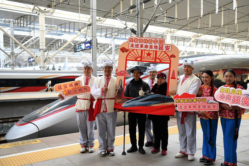 12月26日,乘坐西延高铁首发列车的乘客与演员在延安站站台合影留念。当日,西安至延安高铁开通运营,革命老区延安迈入“高铁时代”。至此,中国高铁运营里程突破5万公里,高铁发展再上新台阶。 新华社记者 张博文 摄