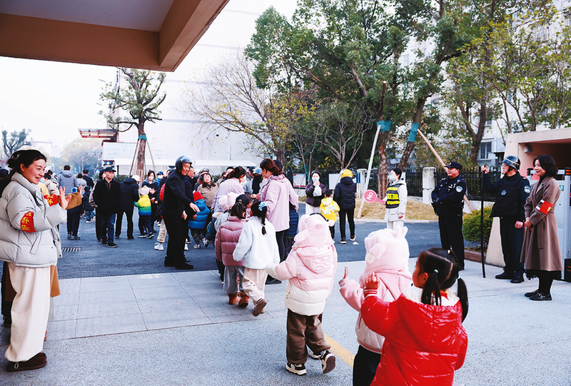 12月26日,池州市直幼教集团杏花村幼儿园放学时刻,教师、安保人员在门口有序引导。(杏花村幼儿园供图)