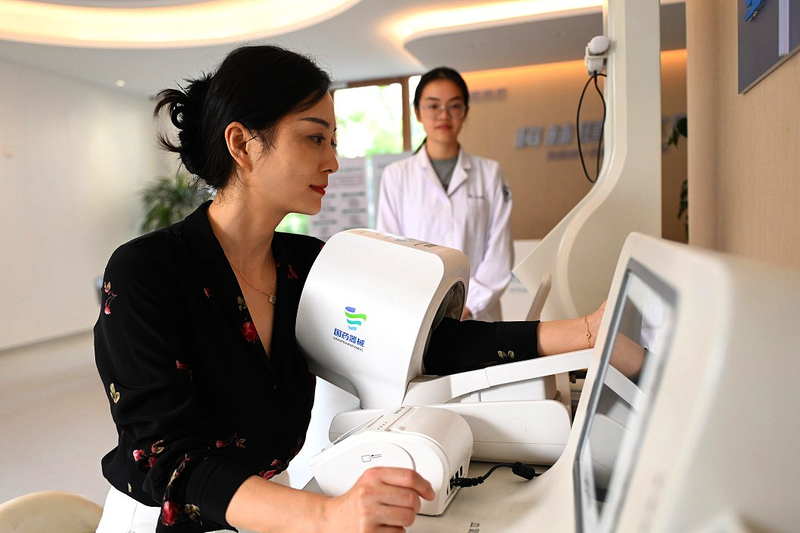 8月4日,一名女士在浙江省杭州市萧山区梅林村的智慧健康小站自助测量血压。梅林村位于浙江省杭州市萧山区。作为“千万工程”的示范村,梅林村经过二十多年的持续发展,成为浙江省首批“未来乡村”试点。 新华社记者 毛竹 摄