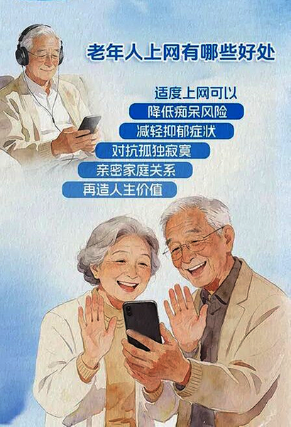 一些研究表明,适度上网对老年人身心健康具有保护作用。中国科学院心理研究所研究员李娟等人发现,使用手机上网能有效延缓认知衰退,降低患痴呆症的风险。香港大学与香港城市大学对23个国家近9万名中老年人的分析也表明,使用互联网与更高的生活满意度、较少的抑郁情绪有关。
