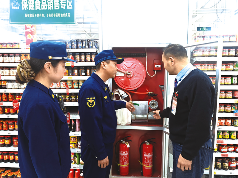 日前,贵池区消防救援大队深入辖区商场超市、沿街门面及高层住宅等重点场所,开展元旦节前消防安全检查,重点核查消防设施配备运行、疏散通道畅通等情况。图为检查现场。 记者 吴双甲 摄