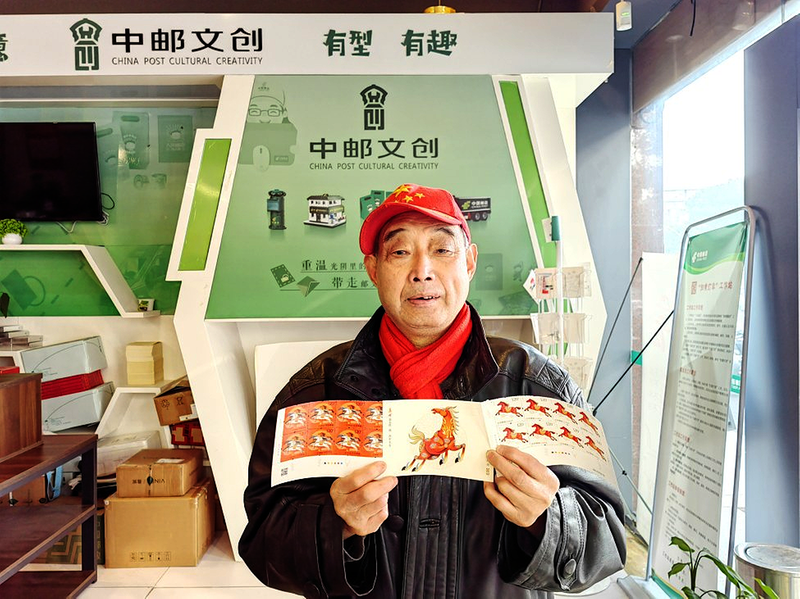 1月5日,市民在中国邮政池州市长江路邮政所展示《丙午年》特种邮票。当天,中国邮政发行《丙午年》特种邮票一套2枚,面值均为1.2元,图案分别为“驰跃宏图”和“万骏臻福”。