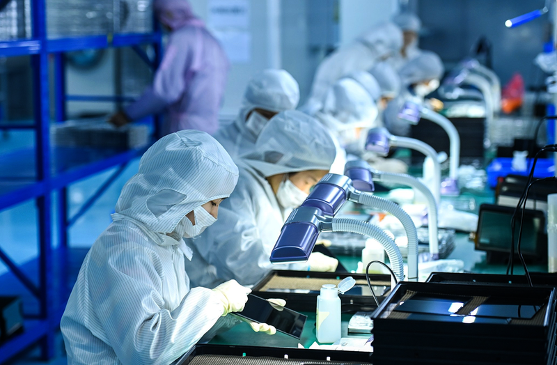 1月4日,位于江西省宜春市铜鼓县的江西京鸿电子科技有限公司工作人员在生产车间赶制电子触摸屏部件。
