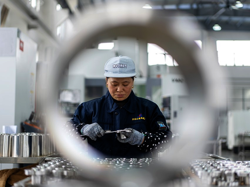 1月5日,工人在位于江苏省兴化市戴南镇的江苏唐刘兴东不锈钢有限公司生产车间检测产品。