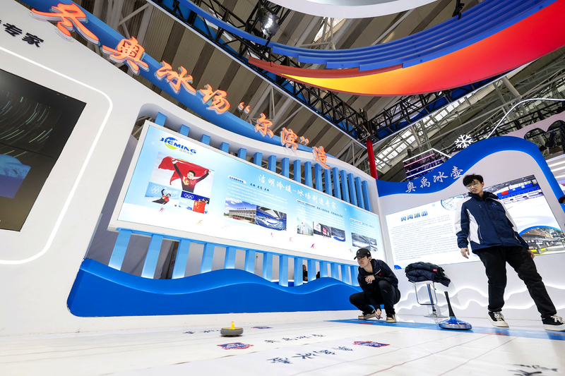 1月6日,参观者在2026哈尔滨国际冰雪经济博览会现场体验冰壶运动。