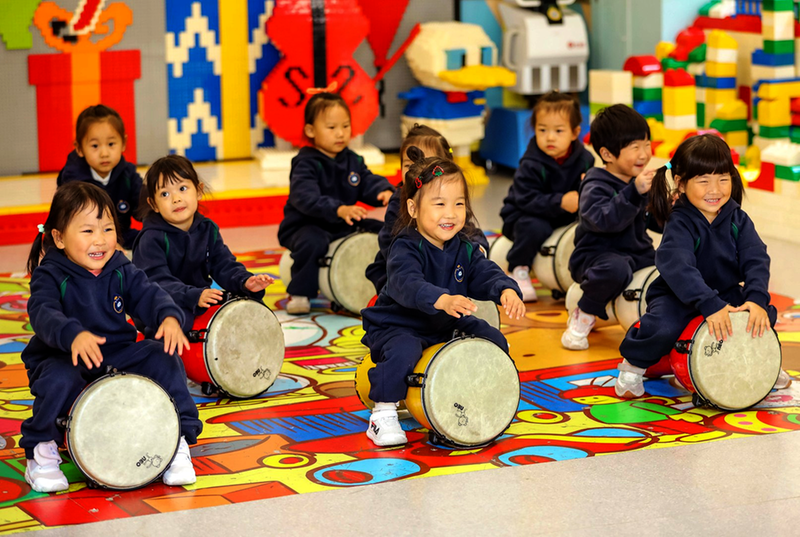 2025年11月4日,在山东青岛恒星科技学院恒星托育中心,老师教托育班的小朋友学习非洲鼓。 新华社发