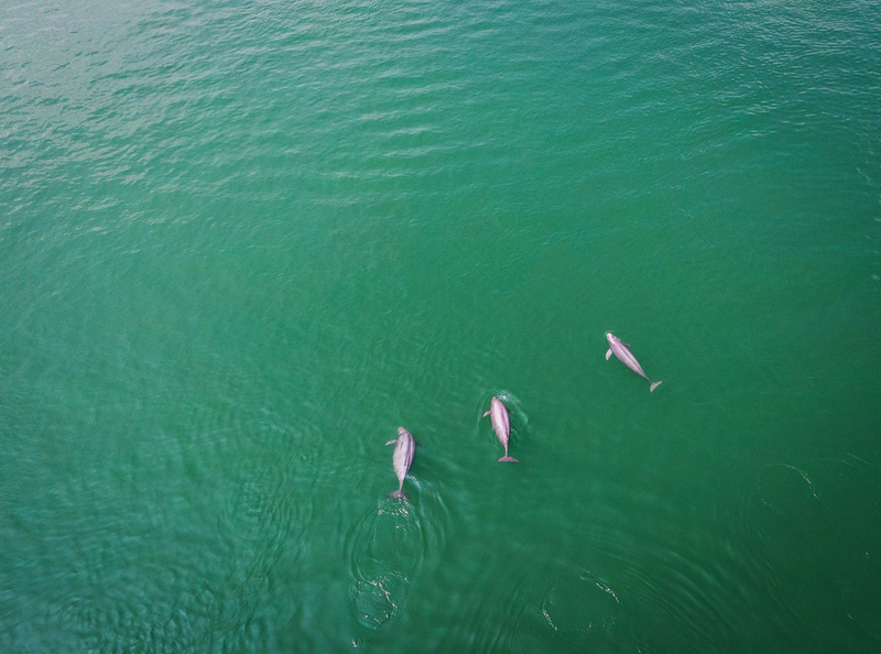 在湖北省宜昌市,长江江豚在水中嬉戏(2021年5月11日摄,无人机照片)。