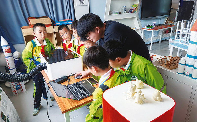 在贵池区高坦中心学校创客中心的创客教室中,教师正引领学生开展3D打印设计教学活动。(高坦中心学校供图)