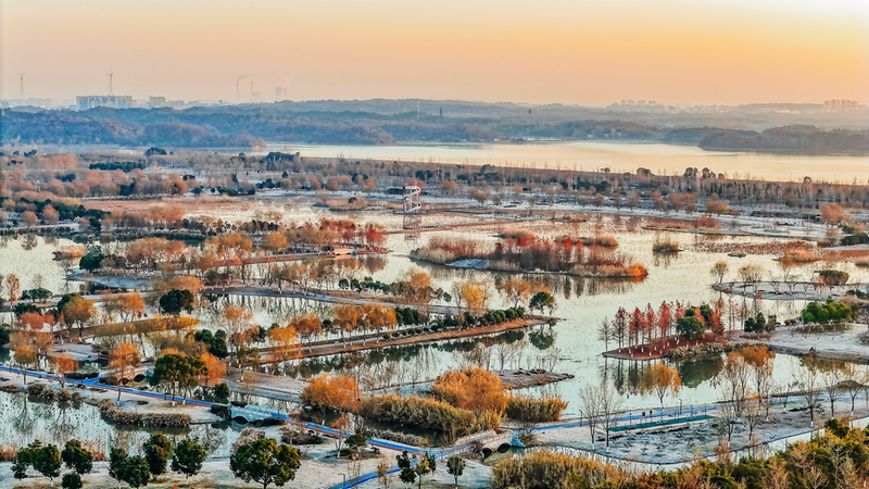 1月11日清晨,一夜寒霜降后,平天湖国家湿地公园披上一层轻纱。晨熹微光中,渐黄渐红的草木披上银霜,与蜿蜒伸展的步道、澄澈如镜的湖水相映成趣。偶有水鸟掠过湖面,翅尖划破粼粼波光,静谧的冬日画卷瞬间灵动起来。