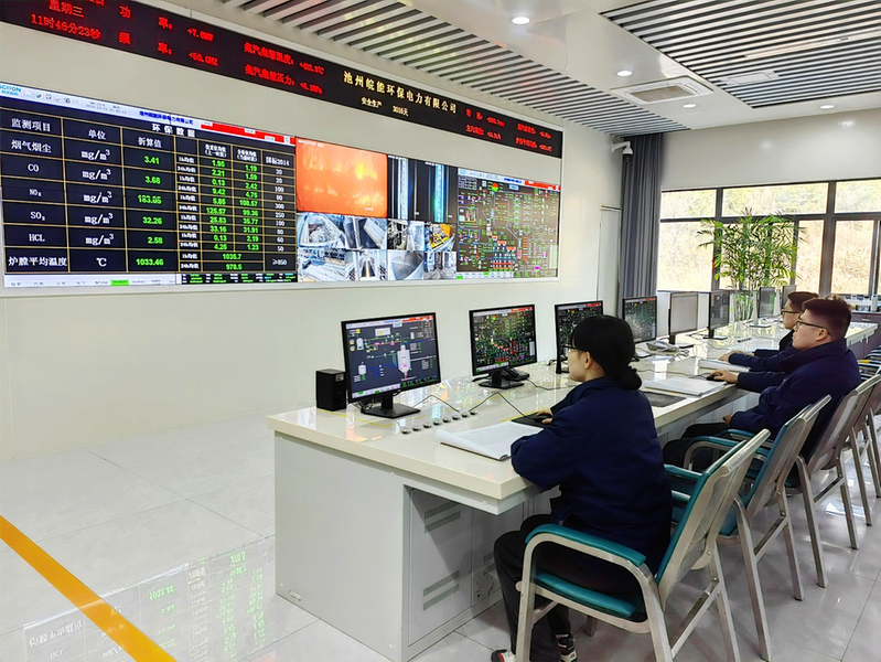 池州皖能环保电力有限公司工作人员在中控室实时监测垃圾焚烧发电设备运行情况。