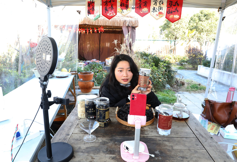 1月14日,贵池区涓桥镇“紫岩陈村民宿·乡村振兴数字赋能示范基地”内,主播正在通过网络平台直播销售助农产品。 记者 吴骏 摄