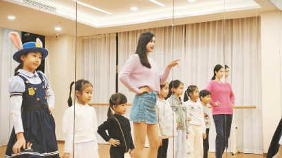瑞虹新城居民、职业模特曹静在给小朋友上课。(资料图片)