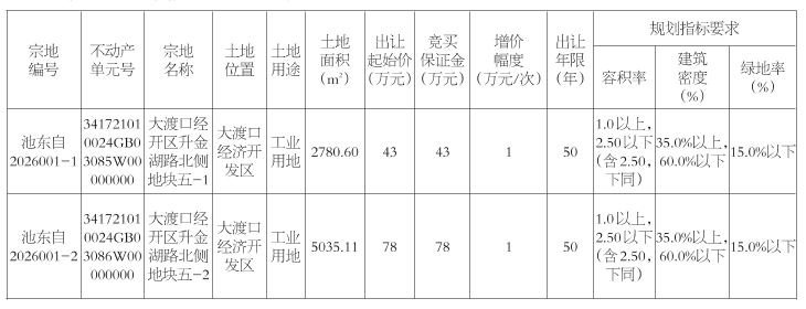 经东至县人民政府批准,东至县自然资源和规划局决定以拍卖方式出让大渡口经济开发区升金湖路北侧地块五-1等地块国有建设用地使用权。现将有关事项公告如下:
