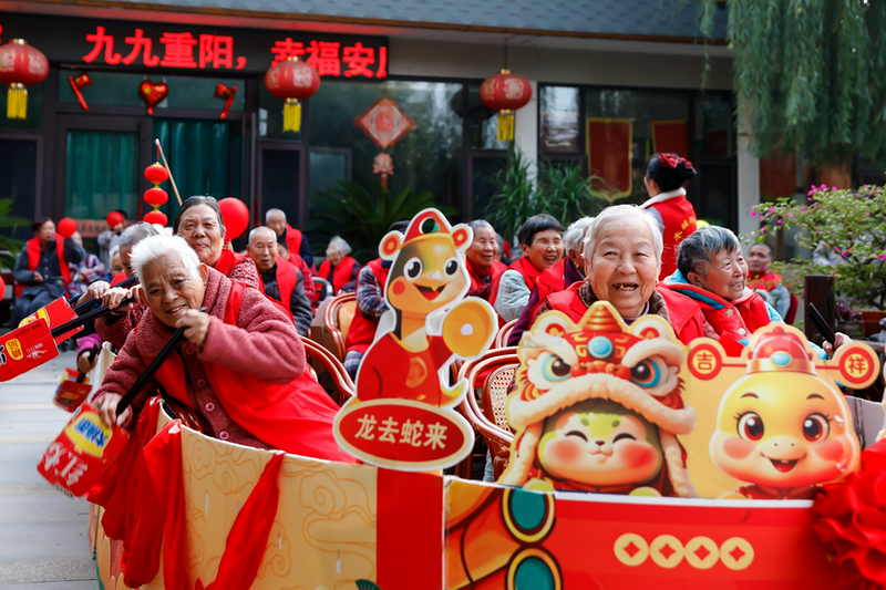 在河南省武陟县木城街道木城养老院,老人们参加“重阳节趣味划船”活动(2025年10月28日摄)。 新华社发