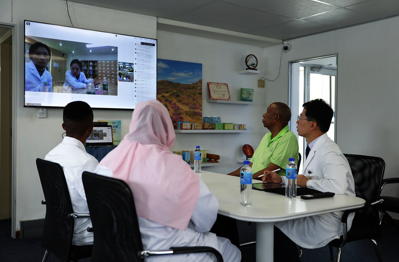 1月21日,在南非约翰内斯堡的非洲中医及针灸中心,成都市中西医结合医院的专家(屏幕中)远程在线参加患者贾布拉内·恩圭尼亚(右二)的会诊。新华社记者 陈为 摄
