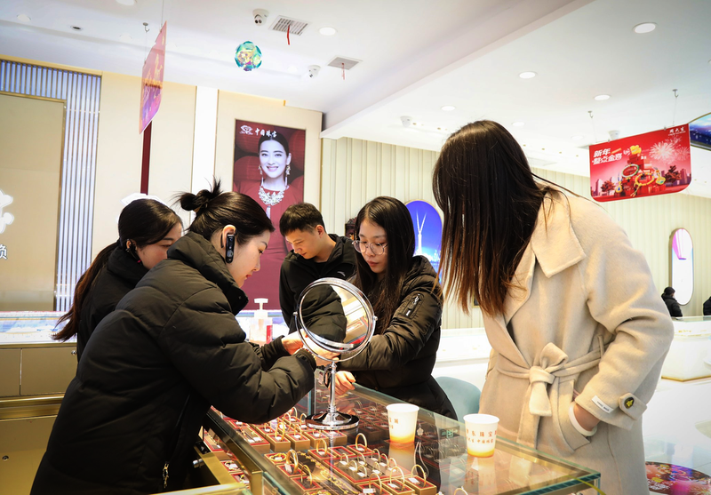马年春节临近,池州主城区黄金消费市场持续升温,多家珠宝店迎来选购热潮。其中,马年生肖主题黄金饰品凭借吉祥的寓意、多样的款式,深受消费者喜爱。图为2月1日,主城区东华东珠宝城,顾客在挑选黄金饰品。